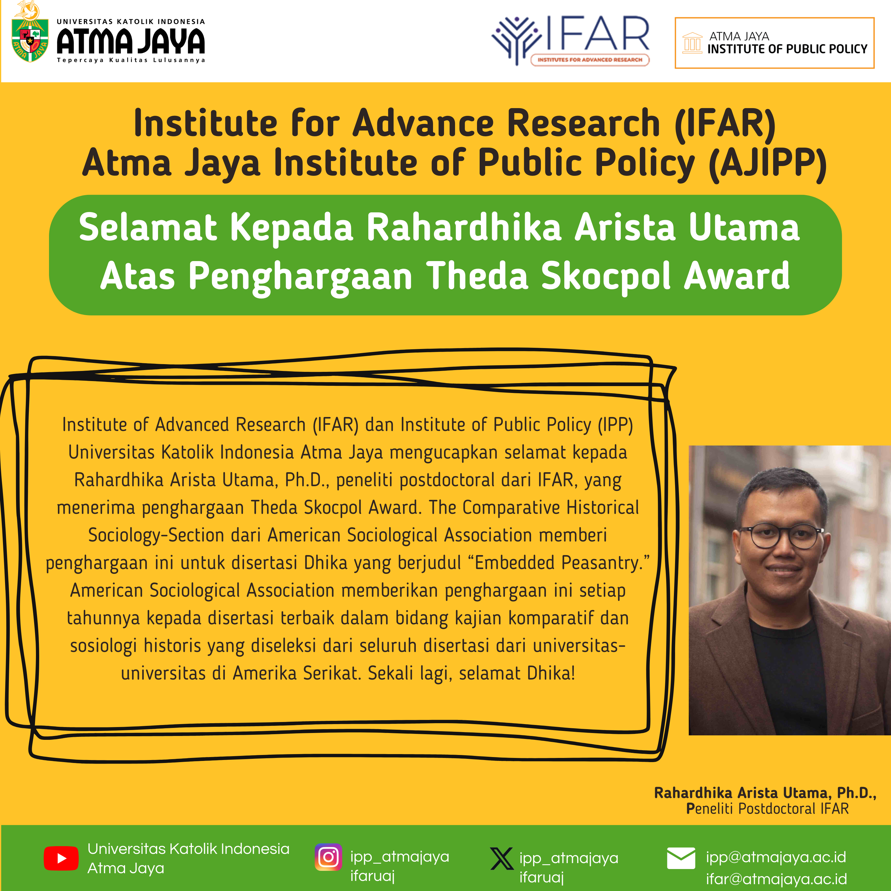 Institute of Advanced Research (IFAR) dan Institute of Public Policy (IPP) Universitas Katolik Indonesia Atma Jaya mengucapkan selamat kepada Rahardhika Arista Utama, Ph.D., peneliti postdoctoral dari IFAR, yang menerima penghargaan Theda Skocpol Award. The Comparative Historical Sociology-Section dari American Sociological Association memberi penghargaan ini untuk disertasi Dhika yang berjudul “Embedded Peasantry.” American Sociological Association memberikan penghargaan ini setiap tahunnya kepada disertasi terbaik dalam bidang kajian komparatif dan sosiologi historis yang diseleksi dari seluruh disertasi dari universitas-universitas di Amerika Serikat. Sekali lagi, selamat Dhika!